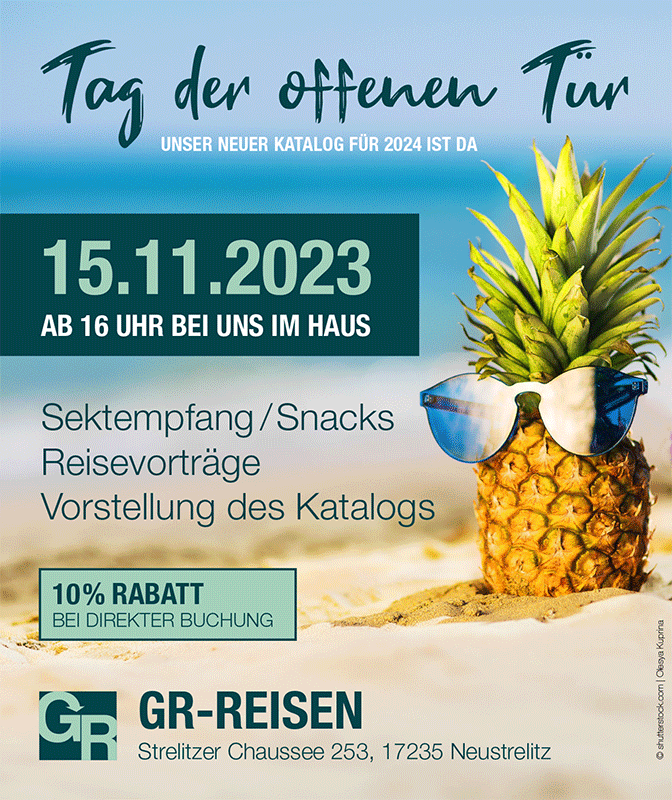 wir laden Sie herzlich zu unserem Tag der offenen Tür bei GR Reisen am 15. November 2023 ab 16 Uhr ein.